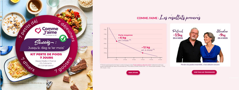 Le programme minceur Comme J'aime ! vous permet de perdre du poids facilement, sans sacrifier votre santé ni vos papilles gustatives. Le site propose des menus spéciaux élaborés par des médecins et des diététiciens qui fournissent 3 délicieux repas par jour ainsi que des en-cas pour les modes de vie nomades que nous menons tous aujourd'hui !